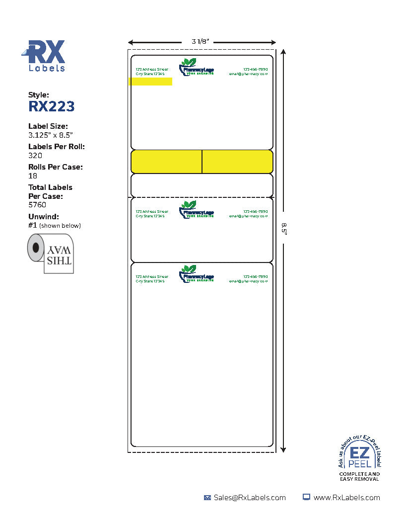 The RX Labels RX-223 prescription label is a high-quality label designed for professional use. It measures 3.125" x 8.5", is pre-printed and blank. The label is ideal for use with an assortment of standard prescription medication bottles. Order your bulk prescription labels now!