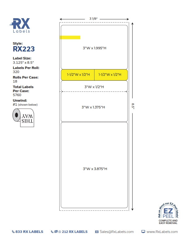 The RX Labels RX-223 prescription label is a high-quality label designed for professional use. It measures 3.125" x 8.5", is pre-printed and blank. The label is ideal for use with an assortment of standard prescription medication bottles. Order your bulk prescription labels now!