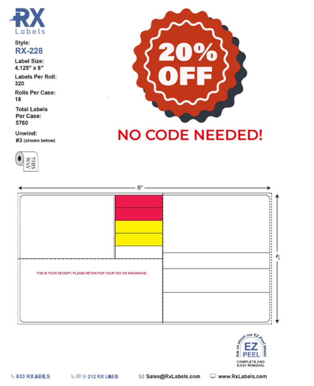 The RX Labels RX-228 prescription label is a high-quality label designed for professional use. It measures 8" x 4", is pre-printed and blank, and is designed to withstand all environmental conditions. This label is suitable for use on prescription medication bottles, vials, and packs. Order your bulk prescription labels now!